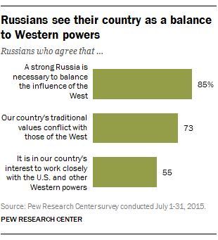 Переважна більшість росіян вважають, що їхня країна є важливою противагою Заходу (85%) і що російські цінності зіштовхуються з західними цінностями (73%).