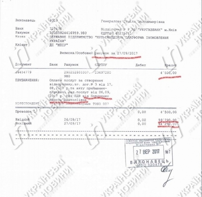 З наданого міністерством рахунку-фактури видно, що 4,5 тисячі гривень від Марини Порошенко надійшли на рахунок держпідприємства 27 вересня – вже після оприлюднення ролика й після запиту журналістів про те, на якій підставі й у якій формі надавала послуги державна студія.