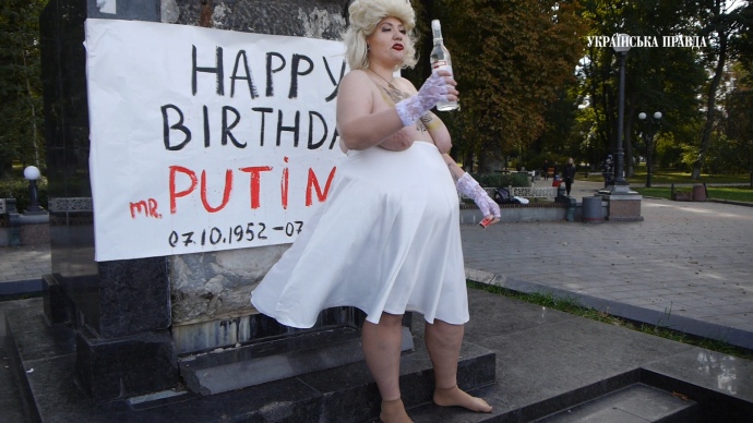 У центрі Києва оголена активістка Femen в образі Мерлін Монро привітала президента РФ Володимира Путіна з днем народження.