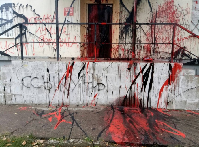 У Києві невідомий облив фарбою будівлю на вулиці Попудренка, 18а, де розташований офіс позафракційного нардепа Віктора Чумака.