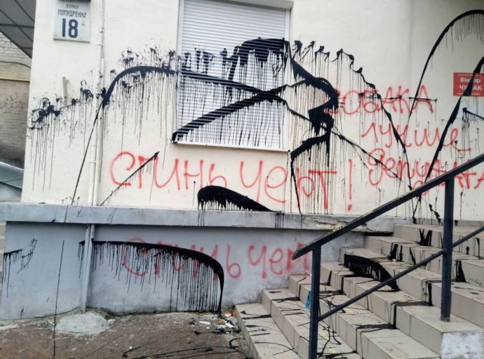 Крім того, на фото, які оприлюднила прес-служба нардепа, видно, що вхід до будівлі облито чорною та червоною фарбами. Також на стінах зроблено написи "Сгинь черт!", "Собака лучше депутата" та "Сын в ответе за отца".