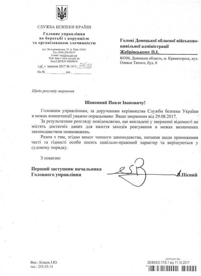 "Повідомляємо, що викладені у зверненні відомості не містять достатніх даних для вжиття заходів реагування в межах визначених законом повноважень", – йдеться в документі.