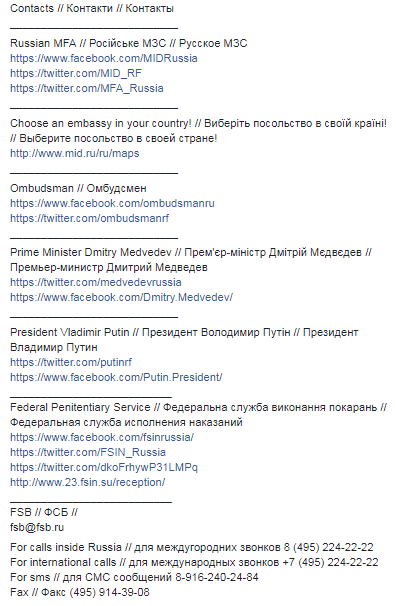 Звертатися пропонують до російського МЗС, посольства РФ у своїй країні, омбудсмена в РФ, глави уряду РФ Дмитра Медведєва, президента РФ Володимира Путіна, Федеральної служби виконання покарань та ФСБ.