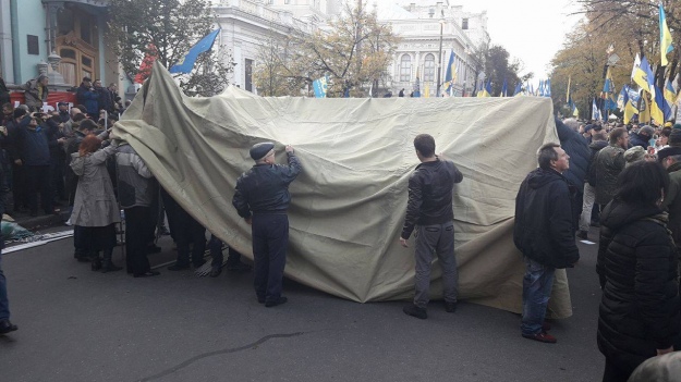Устанавливают палатки под Верховной Радой. Нацгвардейцы не мешают, хотя еще двадцать минут назад была драка. #Протест17 pic.twitter.com/l9rh613rFA