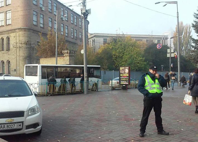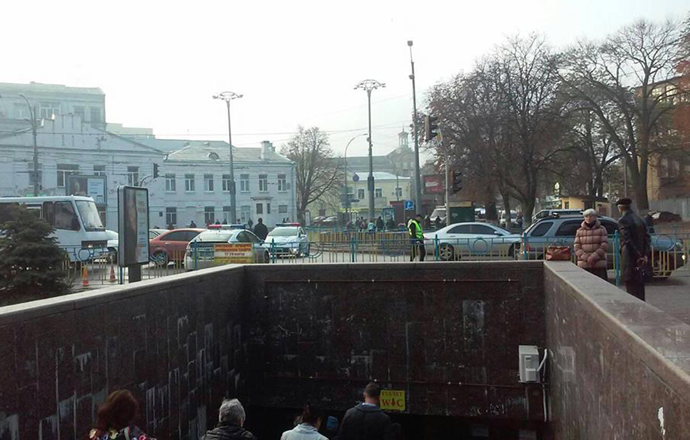 Рух на вулиці Грушевського перекрито двома машинами поліції від станції метро "Арсенальна".