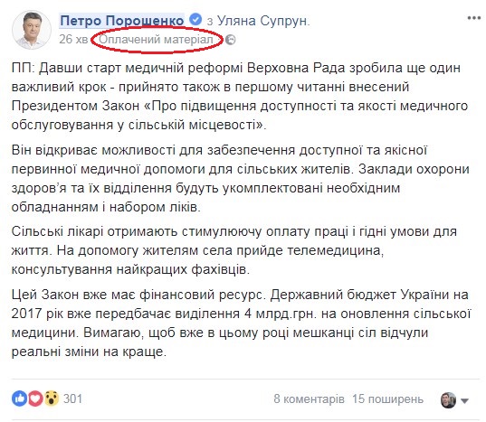 Президент Петро Порошенко опублікував оплачений матеріал у соцмережі Facebook.