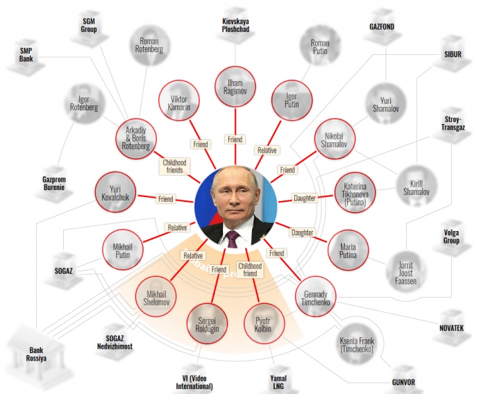 "Згідно з підрахунками OCCRP і рейтингами Форбс-2017, сукупне багатство найближчого кола Путіна – тобто членів сім'ї, старих друзів та друзів, які стали членами сім'ї, складає майже 24 мільярди доларів. Їхні найуспішніші підприємства або пов'язані з переважно підконтрольним державі нафтогазовим сектором або з іншими державними корпораціями", - йдеться у матеріалі.