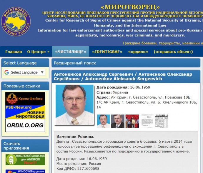 На сайте вказується, що Антонєнков, зокрема, 6 березня 2014 року голосував за проведення референдуму про входження Севастополя до складу Росії.
