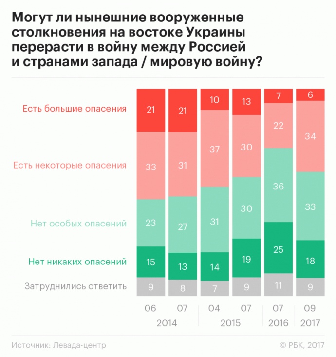 При цьому частка росіян, які побоюються, що збройні зіткнення на сході України можуть перерости у війну між Москвою і Києвом, залишається стабільною. У вересні 2017 року тією чи іншою мірою цього побоювалися 42% респондентів, в липні 2016-го – 40%.