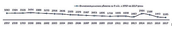 "Згідно з даними статистики за період з 1997 по 2017 роки, кількість умисних убивств, вчинених упродовж дев‘яти місяців кожного року, коливалася від пікового значення у 3494 таких злочини (2000 рік) до найнижчого показника, зафіксованого у цьому році ‑ 1185 умисних убивств. Відтак кількість вбивств, вчинених упродовж 9 місяців 2017 року, порівняно з минулими роками зменшилася майже втричі", - сказав він.