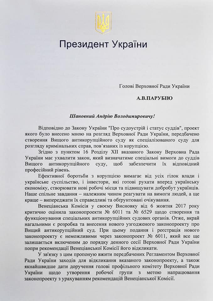 Президент надіслав листа голові Верховної Ради з пропозицією "вжити передбачені Регламентом заходи для відкликання законопроекту №6011 "Про антикорупційні суди", а також якнайшвидше доручити голові профільного комітету утворити робочу групу з напрацювання відповідного законопроекту з урахуванням рекомендацій Венеціанської комісії.