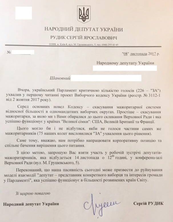 "Вважаю, що нам потрібно напрацювати корпоративну позицію за спільне бачення вирішення цього питання", – звернувся Рудик до нардепів-"мажоритарників".