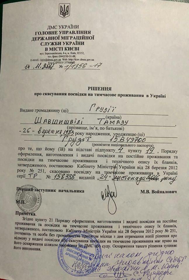 Саакашвілі публікує документ Головного управління Державної міграційної служби в місті Києві, згідно з яким посвідку Шавшишвілі скасували згідно підпункту 4 пункту 19 урядової постанови "Про затвердження Порядку оформлення, виготовлення і видачі посвідки на постійне проживання та посвідки на тимчасове проживання".