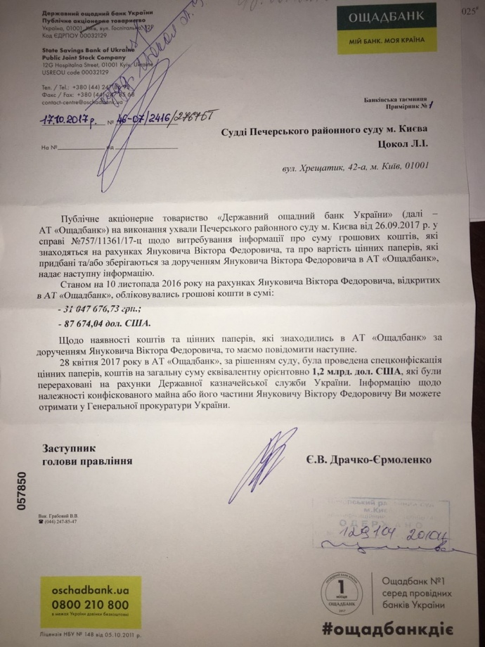 "За вимогою суду банк надав відомості, що станом на 10 листопада 2016 року на рахунках Віктора Януковича були кошти у сумі 31 047 676,73 грн та 87 674,04 доларів США. Тобто ніяких 1,15 млрд доларів США там не було і немає", – сказано в повідомленні.