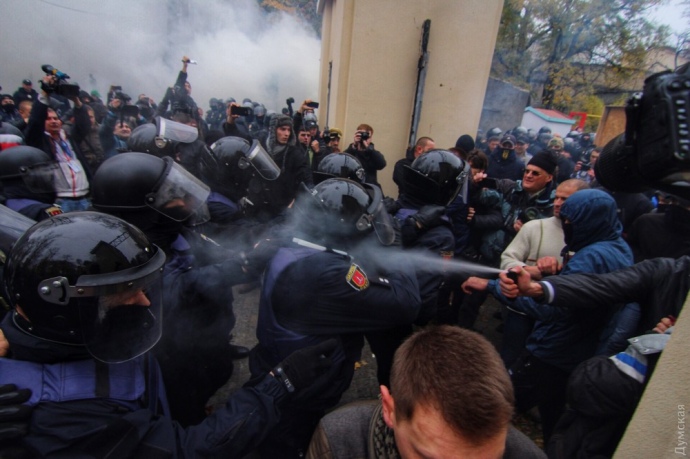 "Начальник одеської поліції Дмитро Головін отримав травму в ході зіткнень з протестуючими - йому розбили голову", - пише видання.