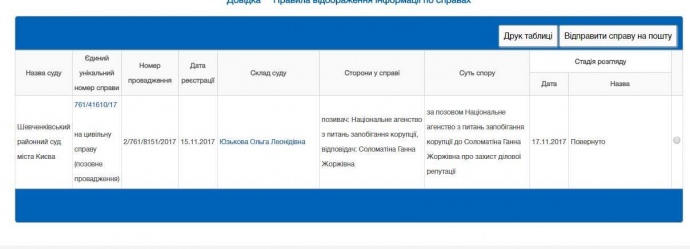 Зазначається, що позов проти Соломатіної НАЗК подало 15 листопада, а 17 листопада його було повернуто. Причина такого рішення не повідомляється.