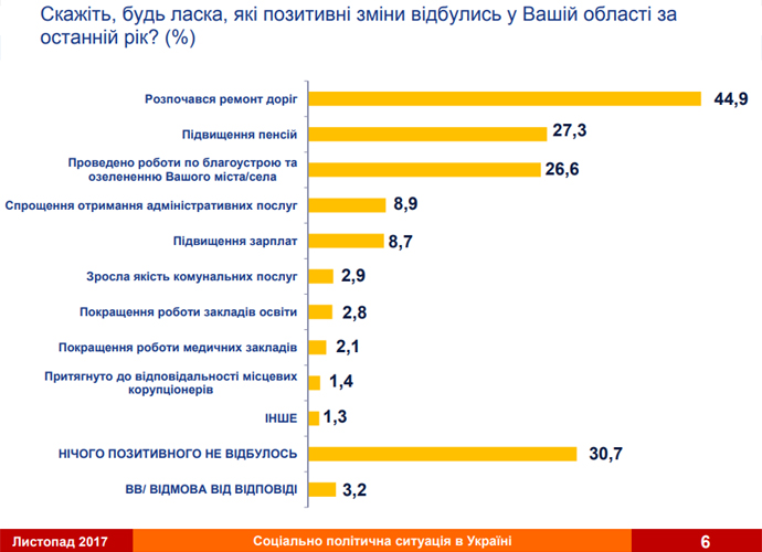 Серед позитивних змін, які відбулися у їхній області за останній рік, 44,9% опитаних назвали ремонт доріг, 27,3 % – підвищення пенсій, 26,6 % – благоустрій і озеленення міста чи села.
