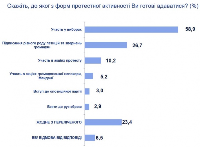 58,9% налаштовані висловлювати свій протест голосом на виборах. Ще 26,7% готові підписувати петиції та звернення.