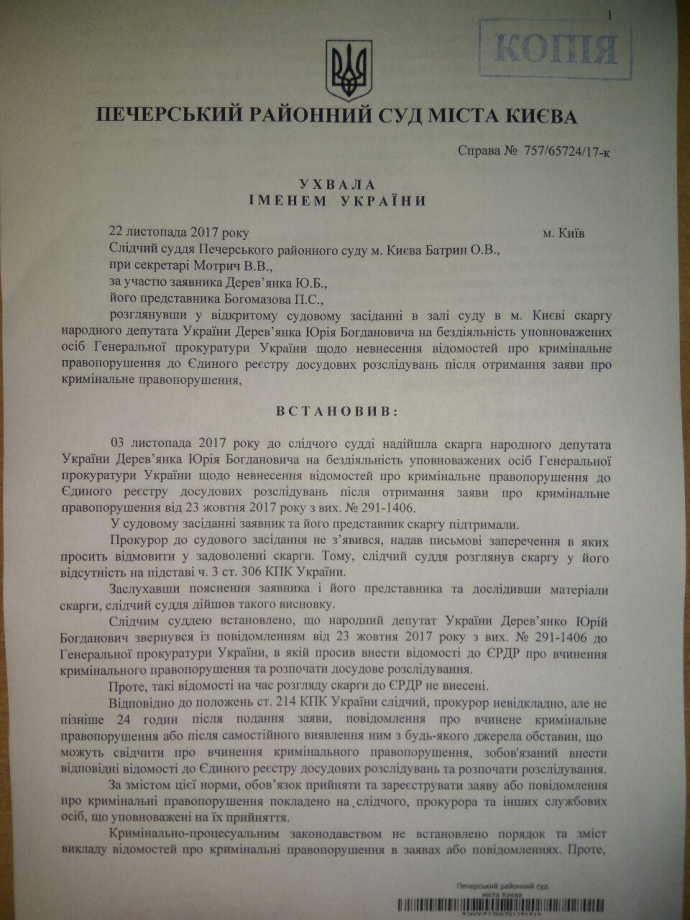"Зобов’язати уповноважених осіб Генеральної прокуратури внести відомості до Єдиного реєстру досудових розслідувань за повідомленням народного депутата Дерев'янка Юрія Богдановича від 23 жовтня 2017 року про вчинення кримінального правопорушення та розпочати досудове розслідування", - йдеться в ухвалі суду.
