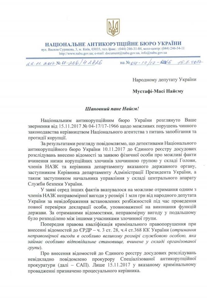 "Детективами НАБУ 10.11.2017 до ЄРДР внесено відомості за заявою фізичної особи про можливі факти вчинення низки корупційних злочинів злочинною групою у складі голови, членів та керівника департаменту НАЗК, заступником керівника департаменту АП, а також заступником начальника управління у складі центрального апарату СБУ", - йдеться в листі.