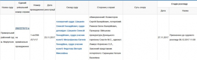 Вищий спеціальний суд з розгляду кримінальних і цивільних справ відправив справу Колмогорова до Маріуполя 14 листопада, Приморський райсуд отримав її 23 листопада. Тепер призначено розгляд.