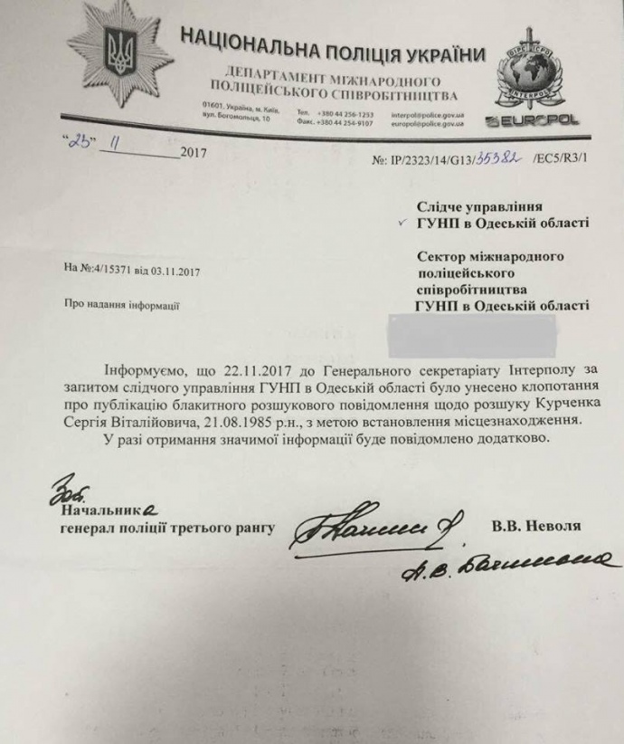 Головне управління Нацполіції в Одеській області внесло клопотання до Генерального Секретаріату Інтерполу про оголошення у міжнародний розшук Сергія Курченка.