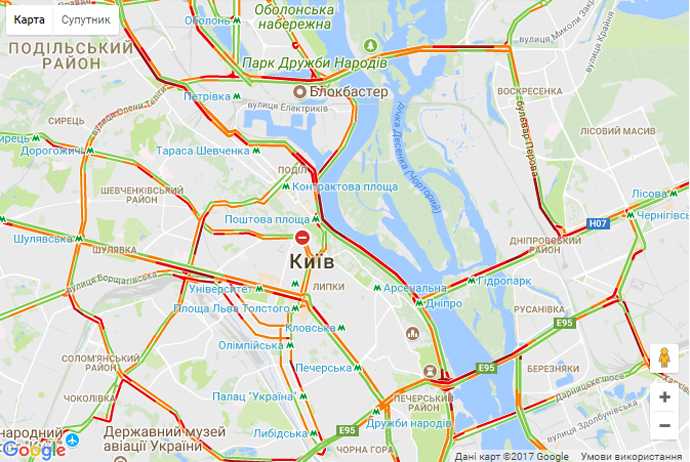 Згідно з картою-схемою заторів від Google, станом на 10 ранку вся столиця стоїть у заторах.