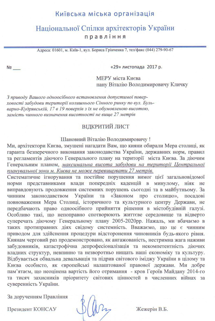 "Ми архітектори Києва змушені нагадати вам, що кияни обирали мера столиці як гаранта безперечного виконання законодавства України, державних норм, правил та регламентів діючого Генерального плану на території міста Києва", - пишуть архітектори.