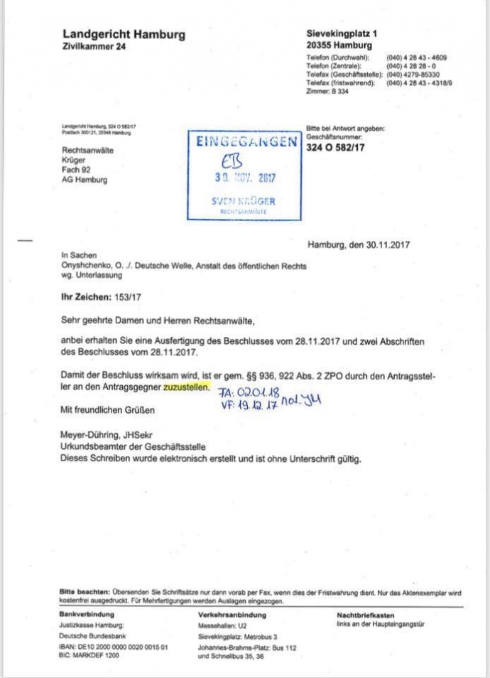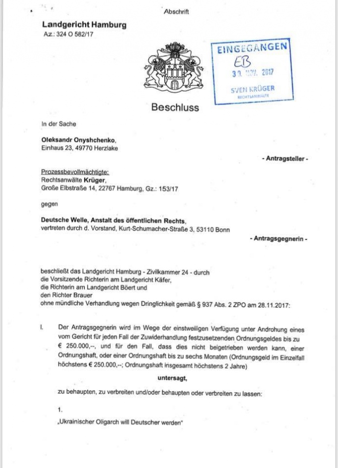 "Результат - виграний суд. Deutsche Welle зобов'язується зняти статті, а якщо опублікує їх повторно - штраф у 250 тис євро", - написав нардеп.