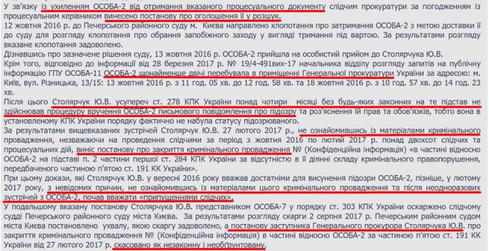 "Після цього Столярчук 4 місяці просто не підписує вже давно готову підозру цій особі, а потім просто закриває справу без будь-яких підстав і з порушенням своїх прав", - зазначає Маселко.
