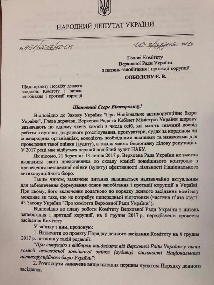 Згідно з листом, Буглак пропонує включити до порядку денного засідання комітету на 6 грудня і розглянути першим питанням відбір кандидата від Верховної Ради у члени комісії незалежної зовнішньої оцінки (аудиту) діяльності НАБУ.