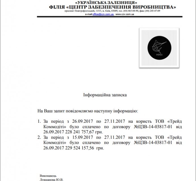 Центр забезпечення виробництва ПАТ "Української залізниці" протягом трьох місяців сплатив 457,7 мільйонів гривень на користь "Трейд Коммодіті" за постачання палива.