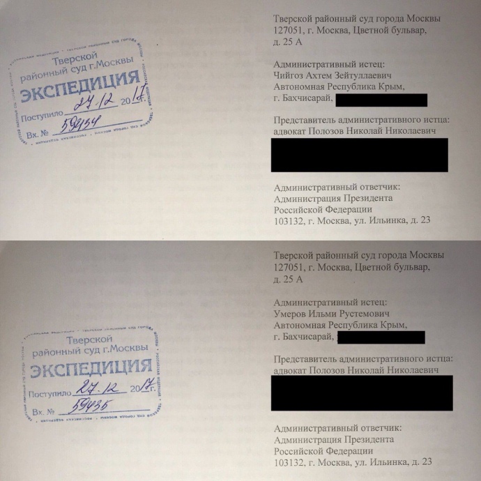Захист кримських татар Ахтема Чийгоза та Ільмі Умерова подав два адміністративні позови до Адміністрації президента Росії.