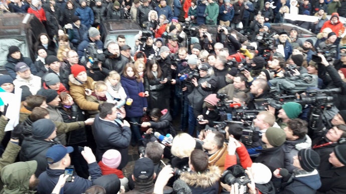 Люди тримають в руках плакати з написами "Винесіть вирок собі". Вони викрикують "Ганьба!" і погрожують зайти всередину. Принесли шини.