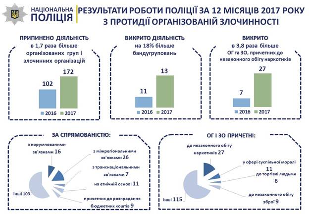 Протягом 2017 року правоохоронні органи припинили діяльність 172 організованих злочинних груп і злочинних організацій - в 1,7 разів більше, ніж у 2016 році.