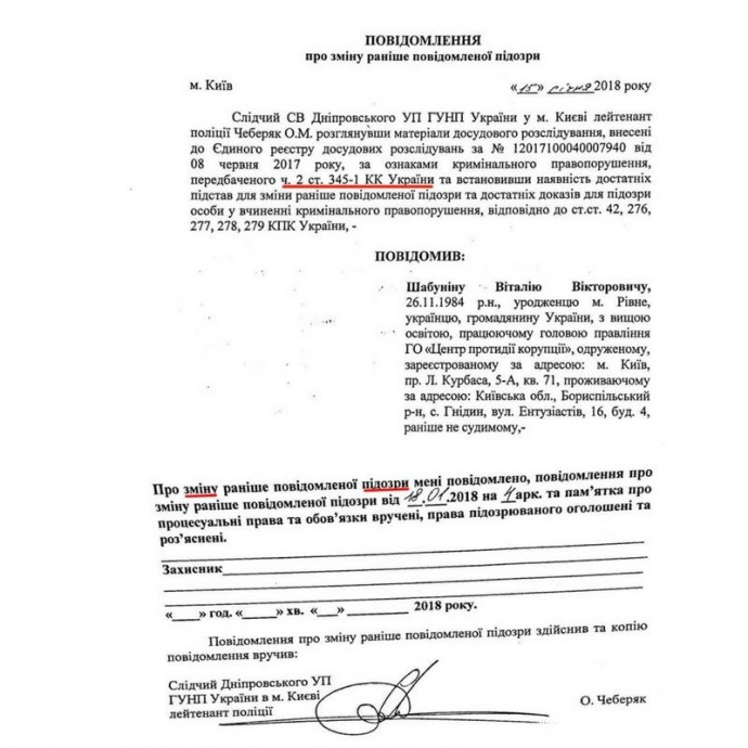 За даними центру, підозра була змінена 15 січня і вручена 18-го слідчим Дніпровського управління поліції Чеберяком.