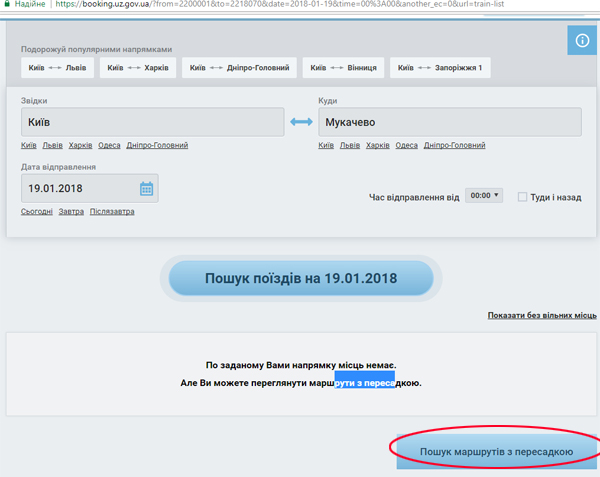 Відтепер на сторінці резервування і придбання проїзних документів у випадку відсутності прямих квитків з'являється додаткова кнопка "пошук маршрутів з пересадкою".
