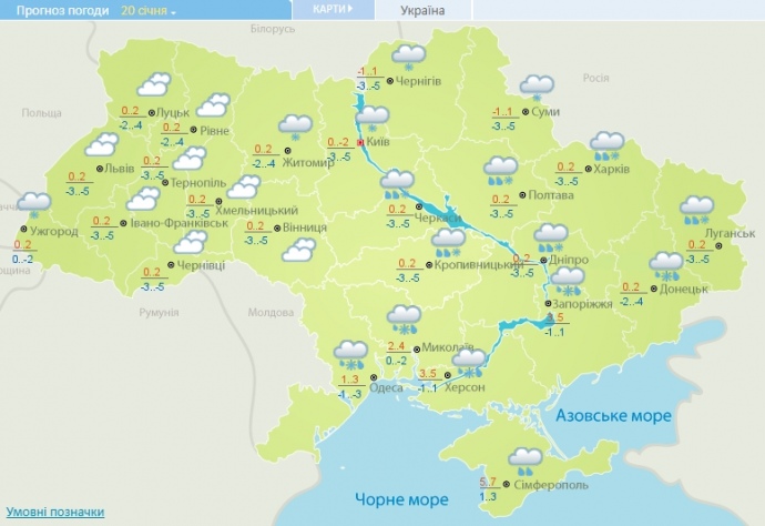 У Карпатах - невеликий сніг, у Полтавській і Кіровоградській областях помірний сніг; температура вночі -4...-9, вдень 0...-5, на Закарпатті - близько нуля.