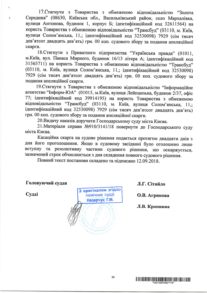 За цією адресою в мережі інтернет "Українська правда" розмістила недостовірну інформацію відносно української юридичної особи - Товариства з обмеженою відповідальністю "Трансбуд". Дана інформація визнана недостовірною судом."