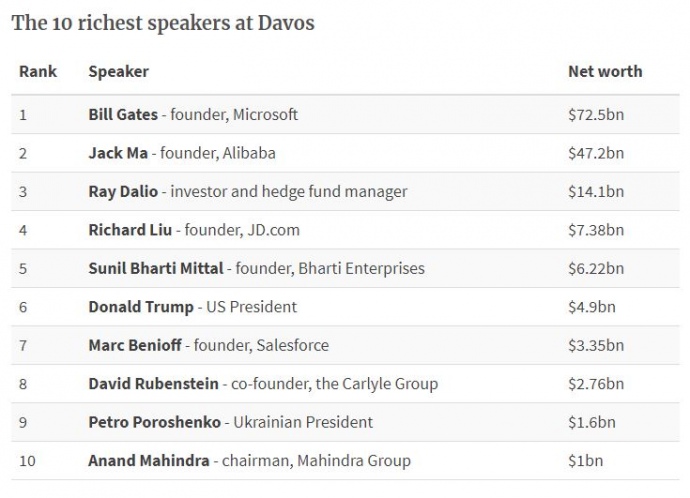 Найбагатшим учасником форуму є засновник Microsoft Білл Гейтс із $ 72 млрд статків, за ним засновник китайського оптового гіганта Alibaba Джек Ма, вартістю 47,2 млрд доларів, і Рей Даліо, інвестор і менеджер хедж-фондів ($ 14,1 млрд).