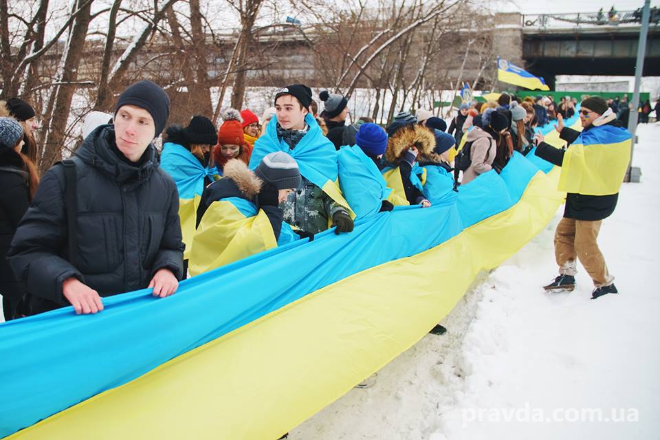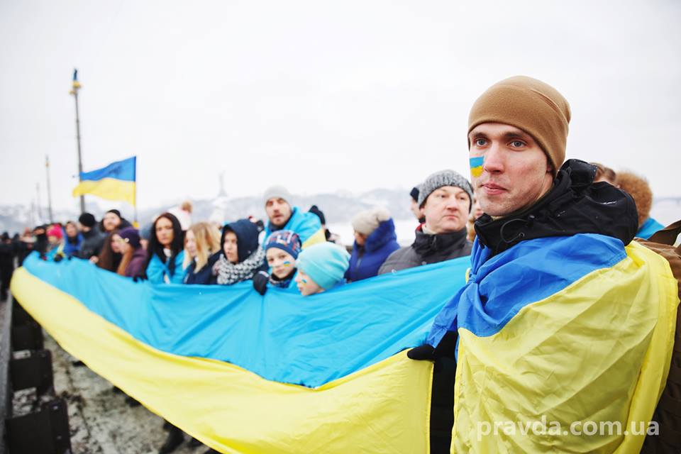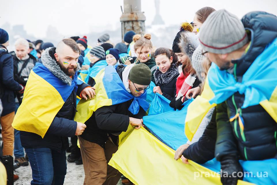 У Києві на мосту Патона люди утворили "живий ланцюг" з нагоди Дня Соборності України.
