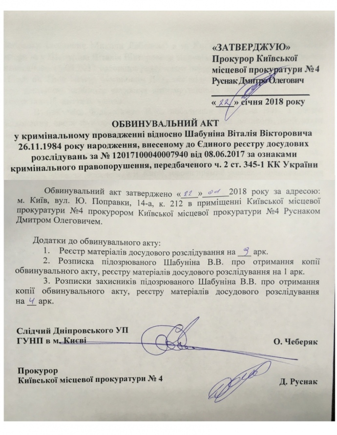 Слідчий та прокурор вручили копію обвинувального акту голові Центру протидії корупції Віталію Шабуніну. Його звинувачують у побитті журналіста.
