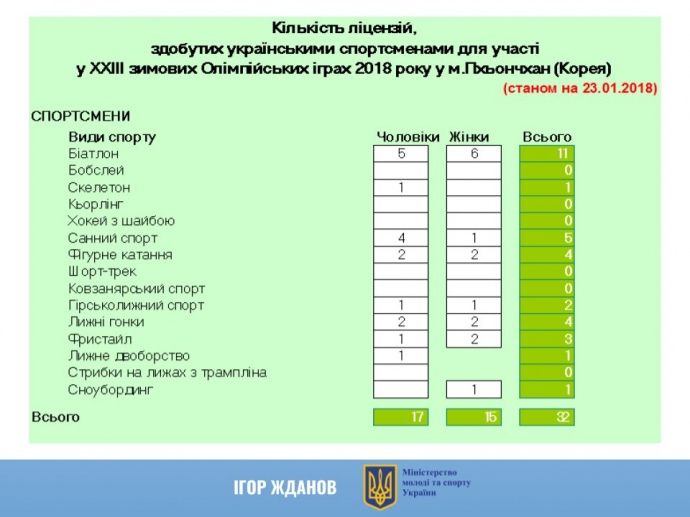 За словами Жданова, Україна наразі представлена у 9 видах спорту: біатлон, скелетон, санний спорт, фігурне катання, гірськолижний спорт, лижні гонки, фристайл, лижне двоборство та сноубординг.