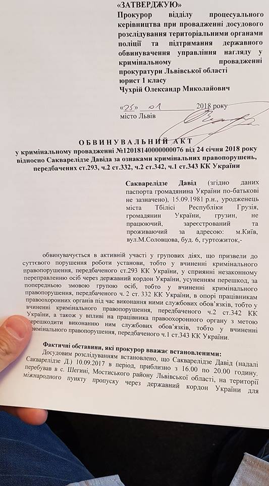 Зазначається, що обвинувальний акт Сакварелідзе отримав 25 січня за ознакою кримінальних правопорушень, передбачених ст. 293, ч. 2 ст.342, ч.1 ст. 343 ККУ.