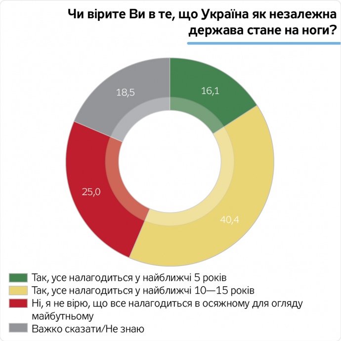 На питання "Чи вірите Ви, що Україна як незалежна держава стане на ноги?" 40,4% відповіли: "Так, все налагодиться в найближчі 10-15 років", 25% - "Ні, я не вірю, що все налагодиться в осяжному майбутньому".