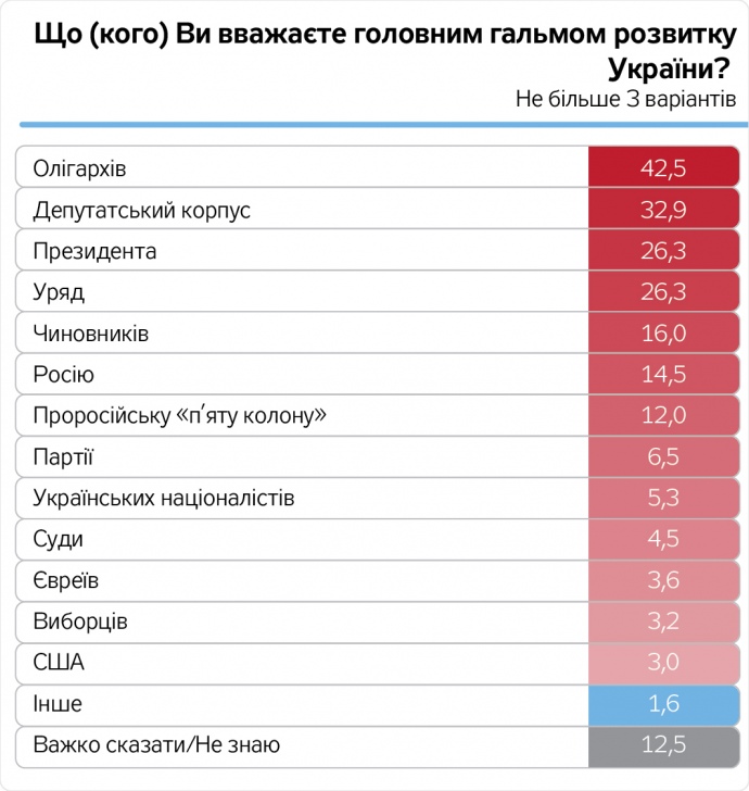 42,5% українців вважають головним гальмом розвитку країни олігархів, 32,9% - депутатський корпус, 26,3% - президента, 26,3% - уряд, 16% - чиновників, 14,5% - Росію і 12% - проросійську "п'яту колону".