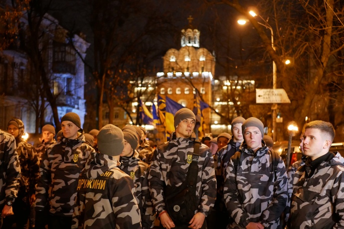 Учасники маршу пам'яті Героїв Крут, після реконструкції битви військ УНР і більшовиків на заводі "Арсенал", пройшли від станції метро Арсенальна до Аскольдової Могили.