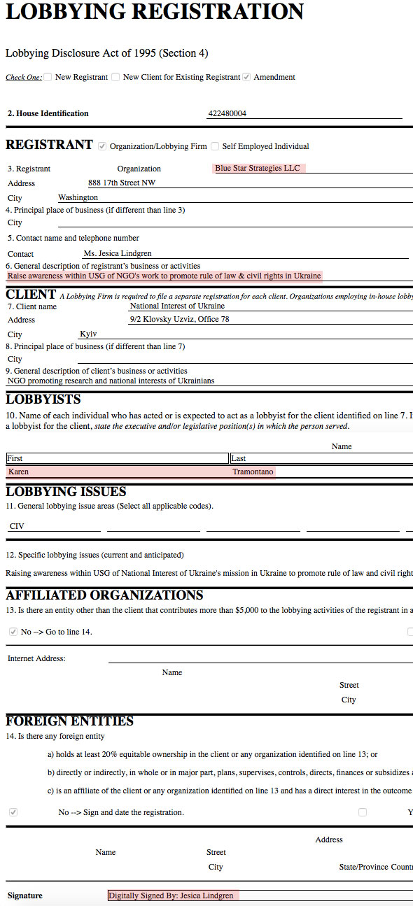 У доповненні до реєстраційної форми Blue Star Strategies назвала своїм завданням – "підвищити поінформованість американського уряду про роботу ГО "Національний інтерес України" з просування верховенства закону і цивільних прав в Україні".