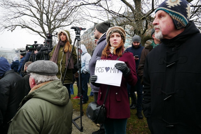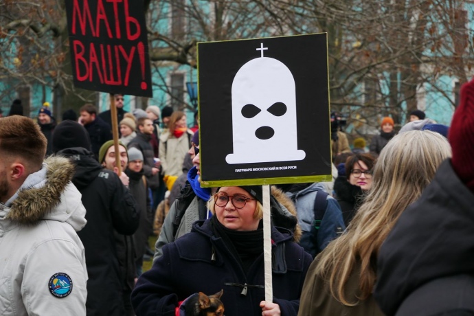 Зокрема, це - представники націоналістичної організації "СІЧ" та кияни, які виступають проти існування храму УПЦ МП на території Десятинки. Учасники акції час від часу скандують "Геть ФСБ!, геть злочинців!", "Геть московського попа!".