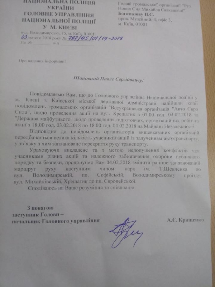 Також вона продемонструвала фотокопію листа за підписом начальника поліції Києва Андрія Крищенка, де вказується, що акції будуть проводити "Авто Євро Сила" і "Держава майбутнього".